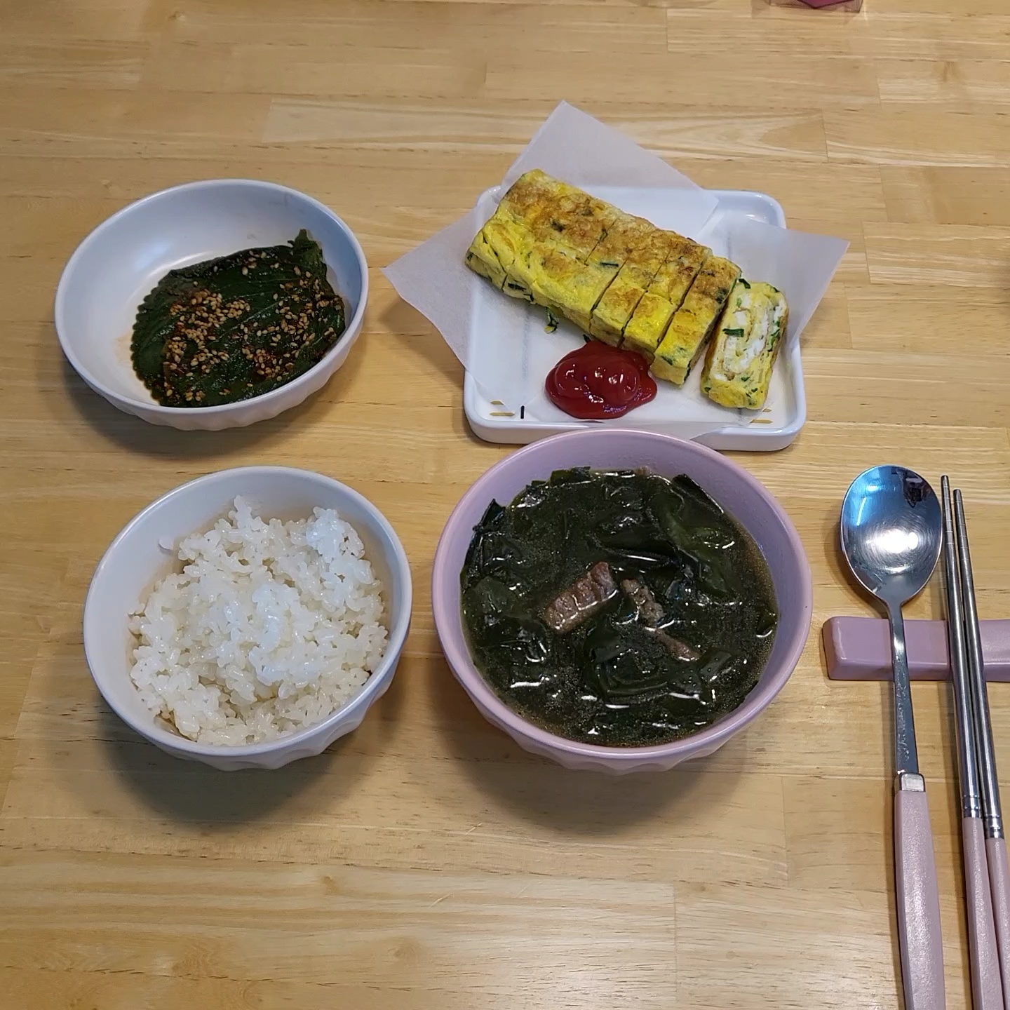 오늘 저의 한끼는 하얀 쌀밥에 소고기미역국, 계란말이, 깻잎찜입니다. 😋
