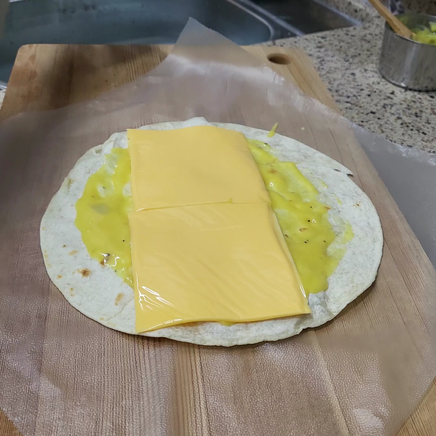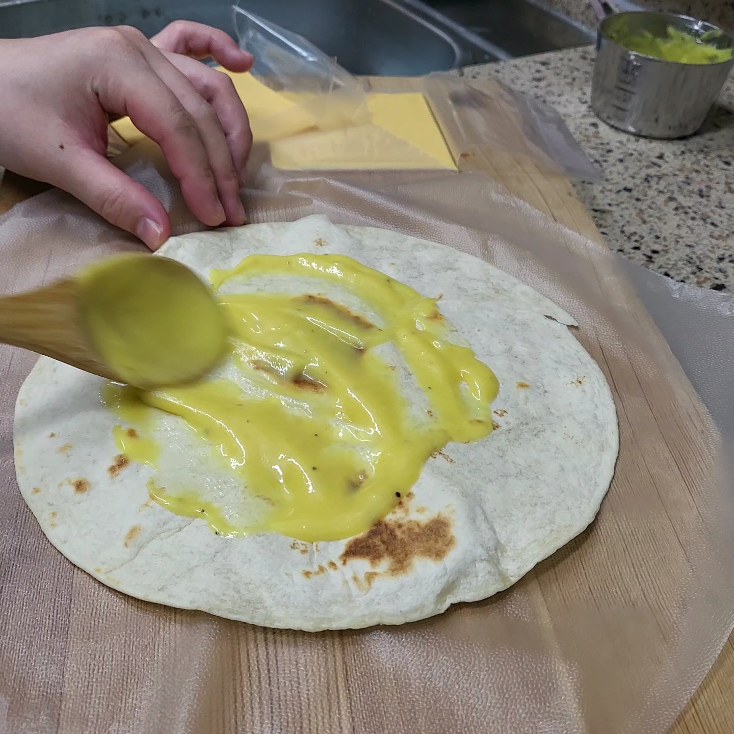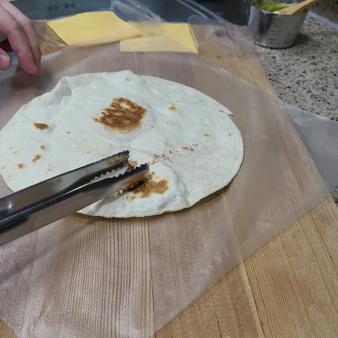 글래드랩을 깔고 그 위에 또띠아를 먼저 얹어줍니다.