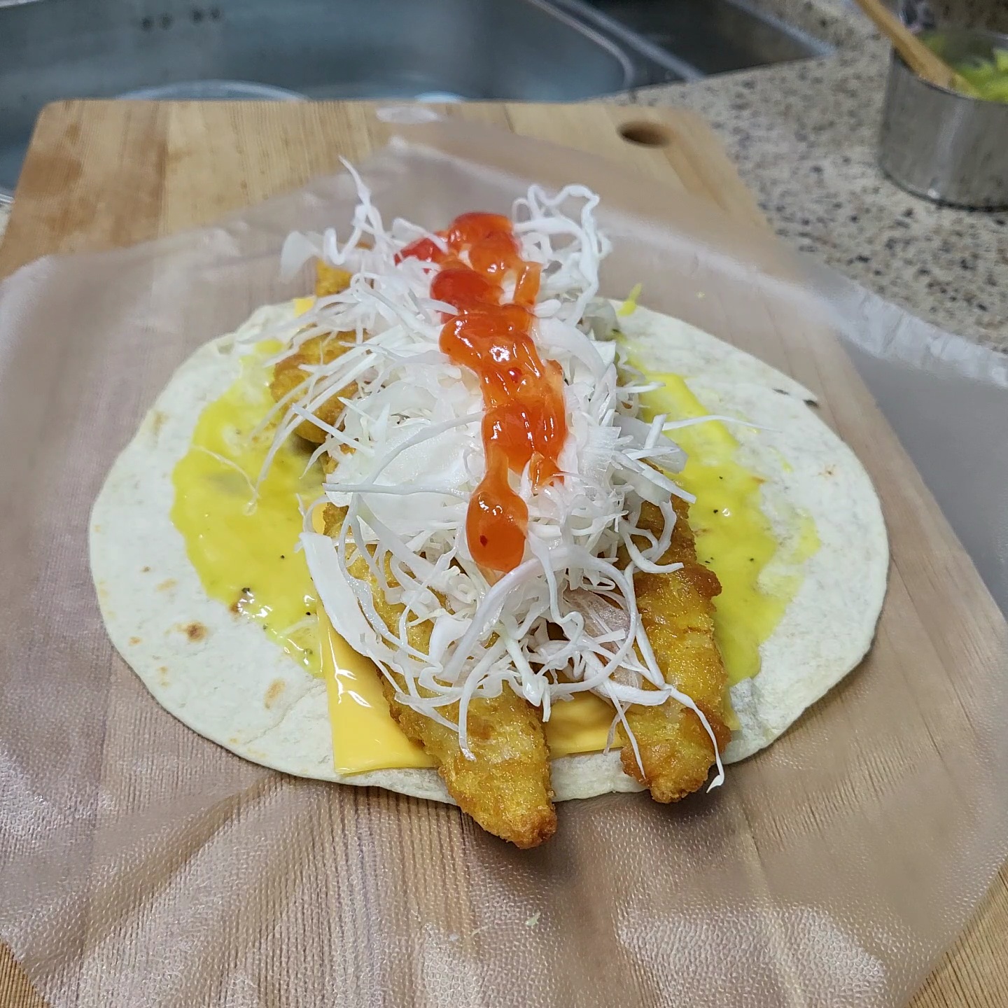 또띠아, 치킨텐더4조각, 양배추, 체다치즈2장, 마요네즈2TS, 머스타드1TS, 후추가루, 설탕2ts, 올리고당1TS, 스위트칠리소스, 글래드랩