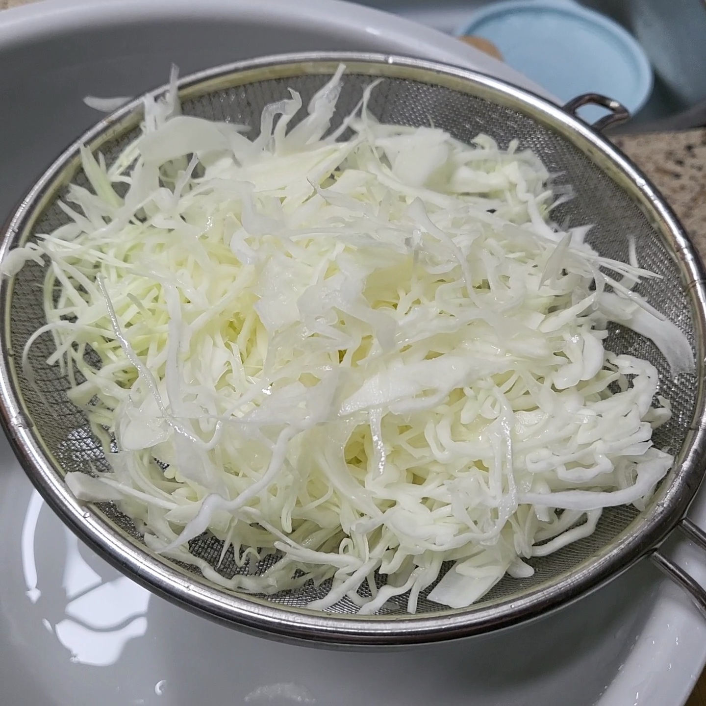 흐르는 물에 헹궈 채망에 물기를 제거해주세요.